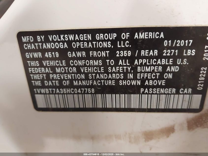 2017 VOLKSWAGEN PASSAT 2017 року Бензин, 1.8, Передній привід, vin - 1VWBT7A35HC047758 з США