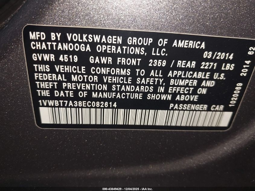 2014 VOLKSWAGEN PASSAT 2014 року Бензин, 1.8, Передній привід, vin - 1VWBT7A38EC082614 з США