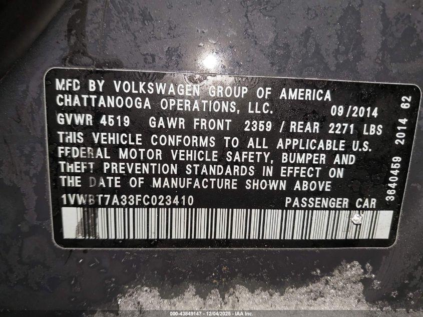 2015 VOLKSWAGEN PASSAT 2015 року Бензин, 1.8, Передній привід, vin - 1VWBT7A33FC023410 з США