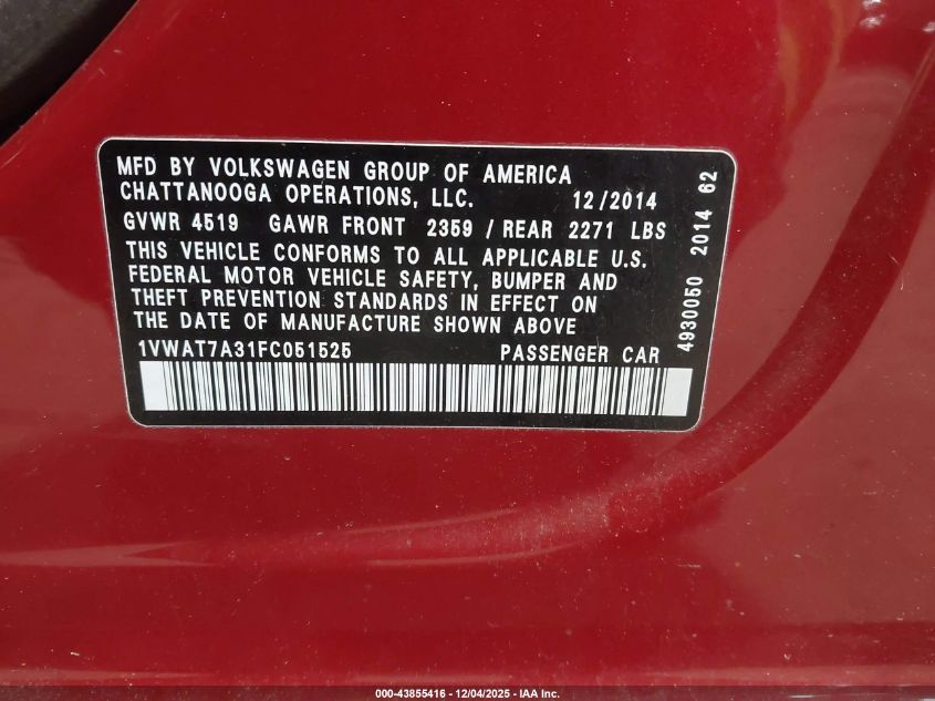 2015 VOLKSWAGEN PASSAT 2015 року Бензин, 1.8, Передній привід, vin - 1VWAT7A31FC051525 з США