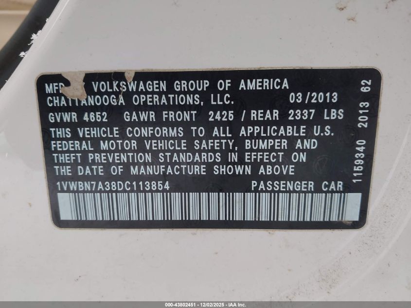 2013 VOLKSWAGEN PASSAT 2013 року Дизель, 2.0, Передній привід, vin - 1VWBN7A38DC113854 з США