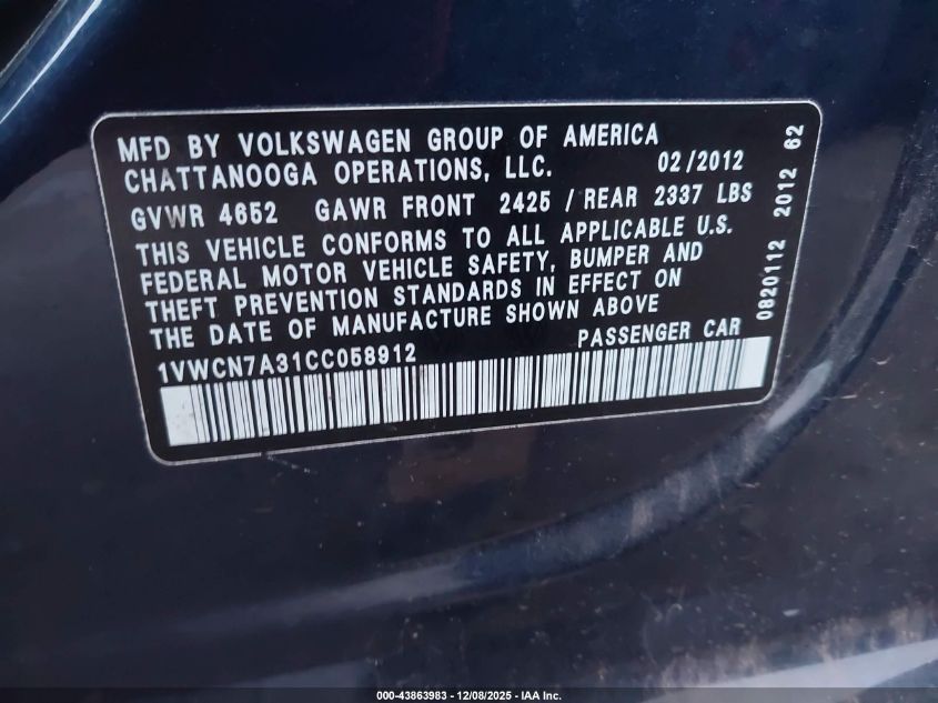 2012 VOLKSWAGEN PASSAT 2012 року Дизель, 2.0, Передній привід, vin - 1VWCN7A31CC058912 з США