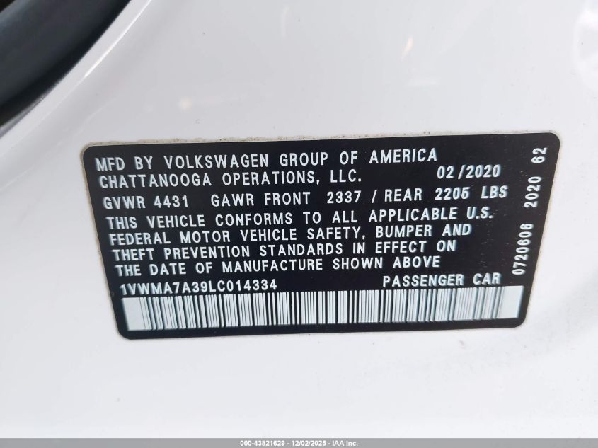 2020 VOLKSWAGEN PASSAT 2020 року Бензин, 2.0, Передній привід, vin - 1VWMA7A39LC014334 з США