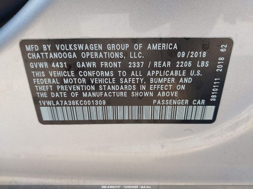 2019 VOLKSWAGEN PASSAT 2019 року Бензин, 2.0, Передній привід, vin - 1VWLA7A38KC001309 з США
