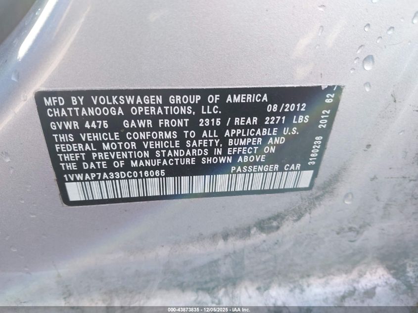 2013 VOLKSWAGEN PASSAT 2013 року Бензин, 2.5, Передній привід, vin - 1VWAP7A33DC016065 з США