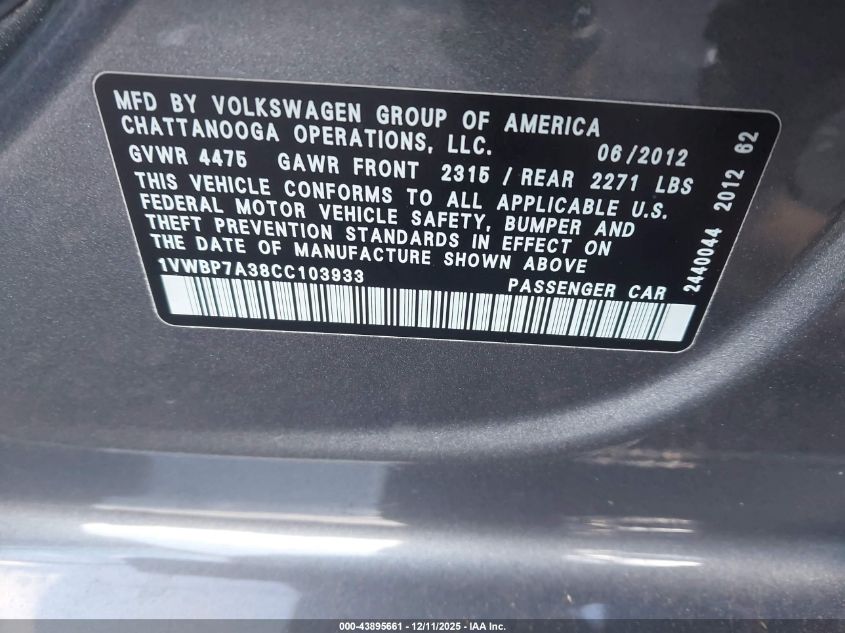 2012 VOLKSWAGEN PASSAT 2012 року Бензин, 2.5, Передній привід, vin - 1VWBP7A38CC103933 з США