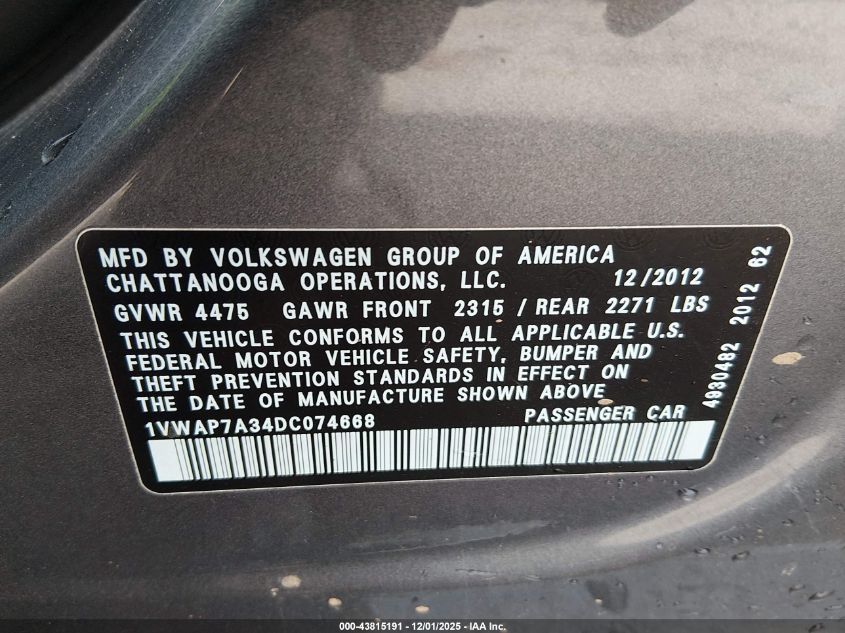 2013 VOLKSWAGEN PASSAT 2013 року Бензин, 2.5, Передній привід, vin - 1VWAP7A34DC074668 з США