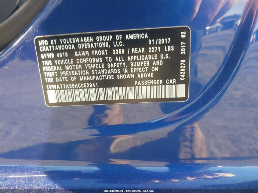 2017 VOLKSWAGEN PASSAT 2017 року Бензин, 1.8, Передній привід, vin - 1VWAT7A35HT052941 з США