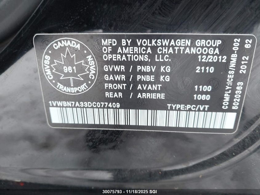 2013 VOLKSWAGEN PASSAT 2013 року Дизель, , Передній привід, vin - 1VWBN7A33DC077409 з США