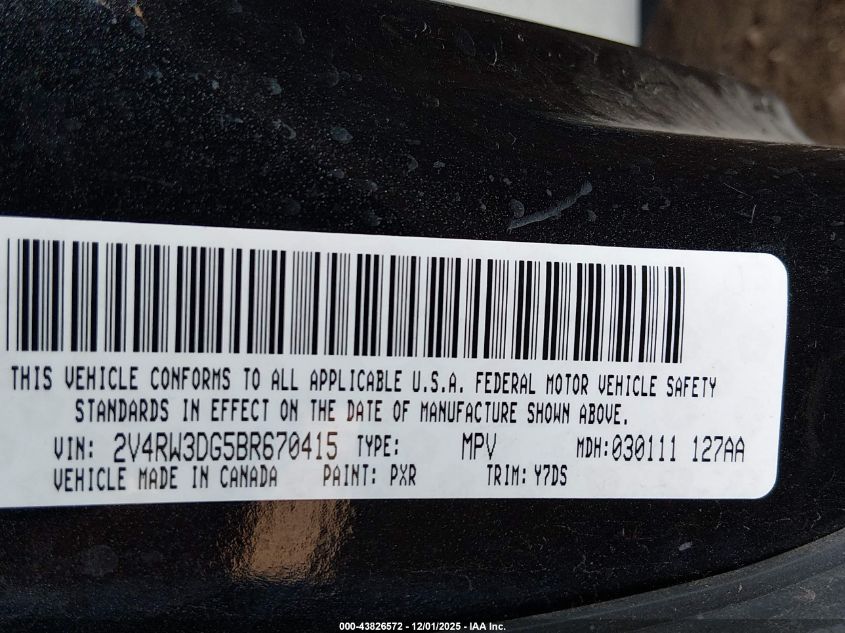2011 VOLKSWAGEN ROUTAN 2011 року Бензин, 3.6, Передній привід, vin - 2V4RW3DG5BR670415 з США