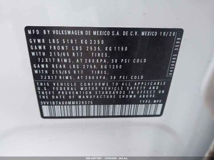 2021 VOLKSWAGEN TIGUAN 2021 року Бензин, 2.0, Передній привід, vin - 3VV1B7AX0MM029375 з США