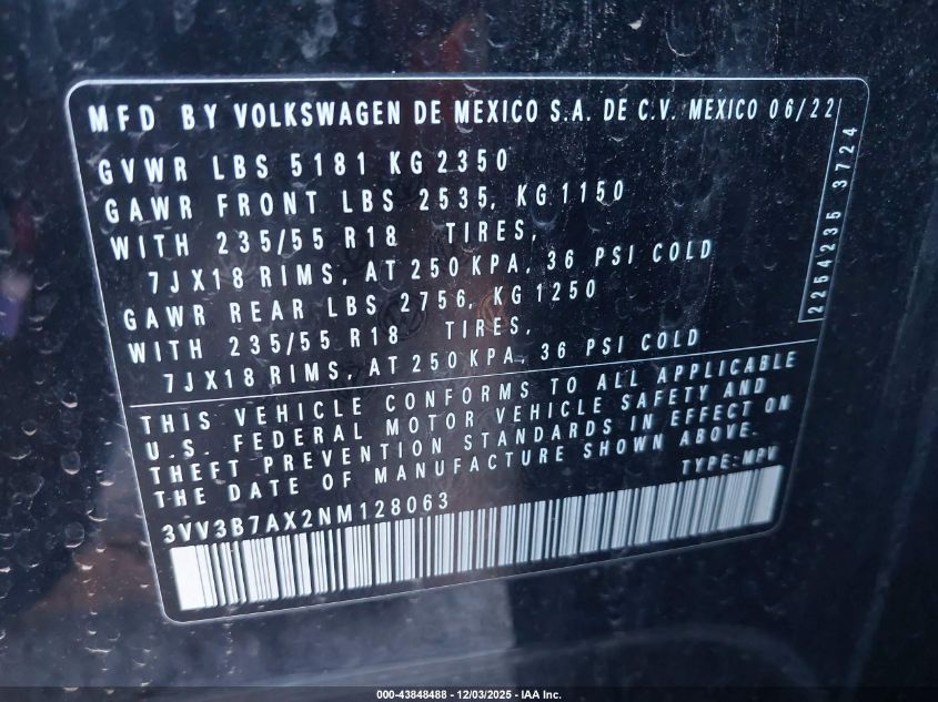 2022 VOLKSWAGEN TIGUAN 2022 року Бензин, 2.0, Передній привід, vin - 3VV3B7AX2NM128063 з США