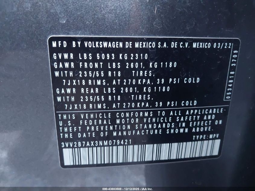 2022 VOLKSWAGEN TIGUAN 2022 року Бензин, 2.0, Повний привід, vin - 3VV2B7AX3NM079421 з США
