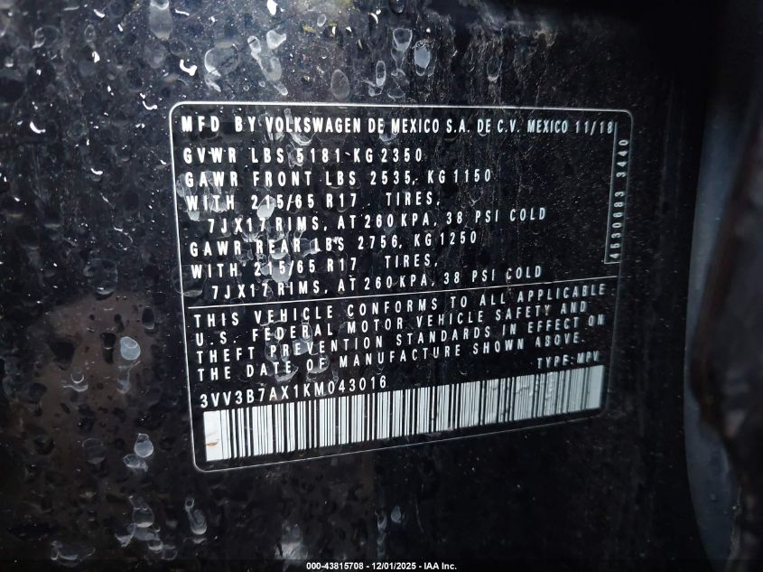 2019 VOLKSWAGEN TIGUAN 2019 року Бензин, 2.0, Передній привід, vin - 3VV3B7AX1KM043016 з США