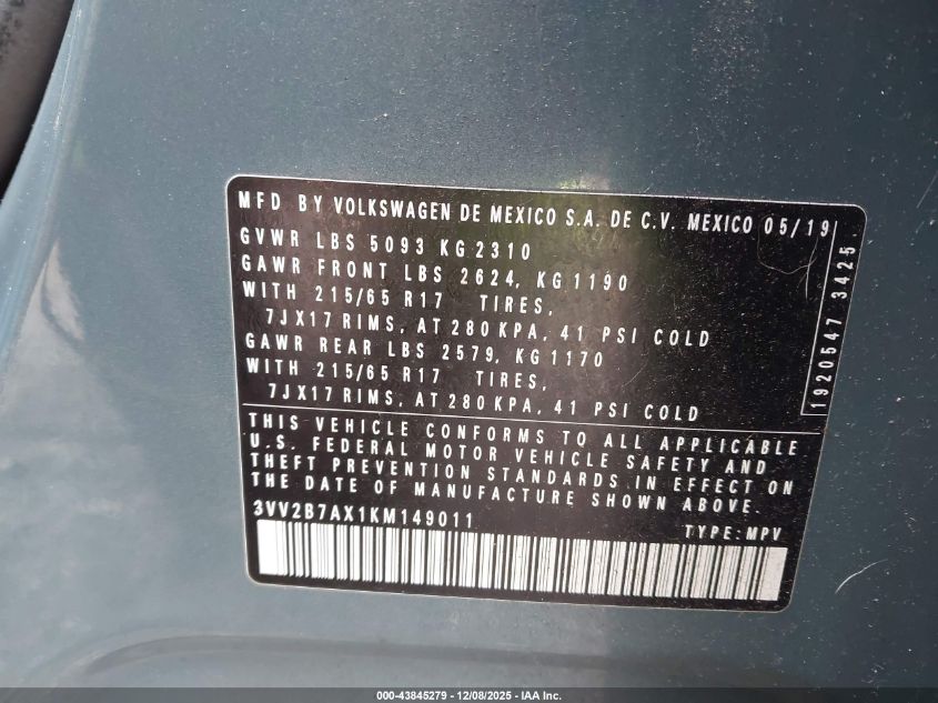 2019 VOLKSWAGEN TIGUAN 2019 року Бензин, 2.0, Повний привід, vin - 3VV2B7AX1KM149011 з США