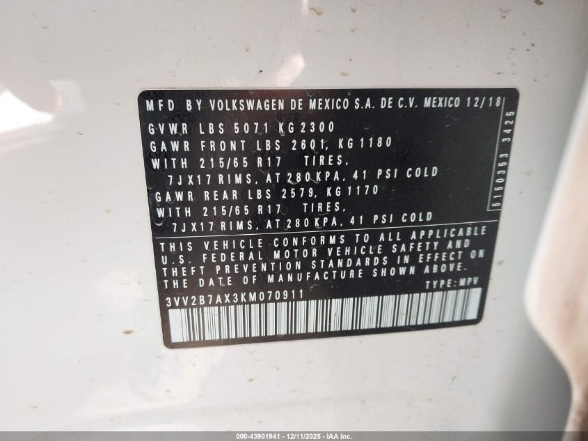 2019 VOLKSWAGEN TIGUAN 2019 року Бензин, 2.0, Повний привід, vin - 3VV2B7AX3KM070911 з США