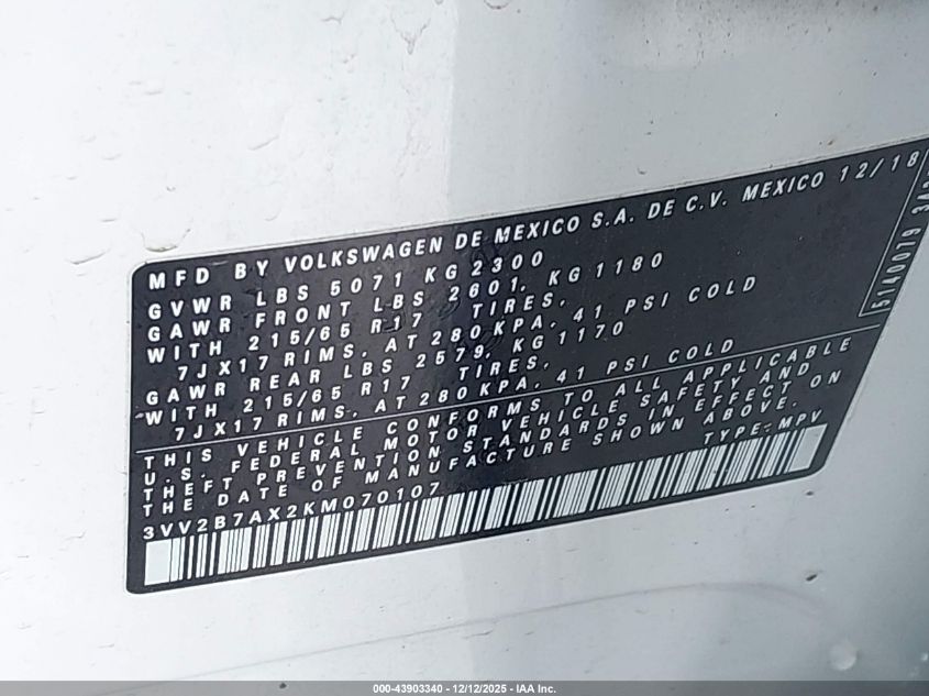 2019 VOLKSWAGEN TIGUAN 2019 року Бензин, 2.0, Повний привід, vin - 3VV2B7AX2KM070107 з США