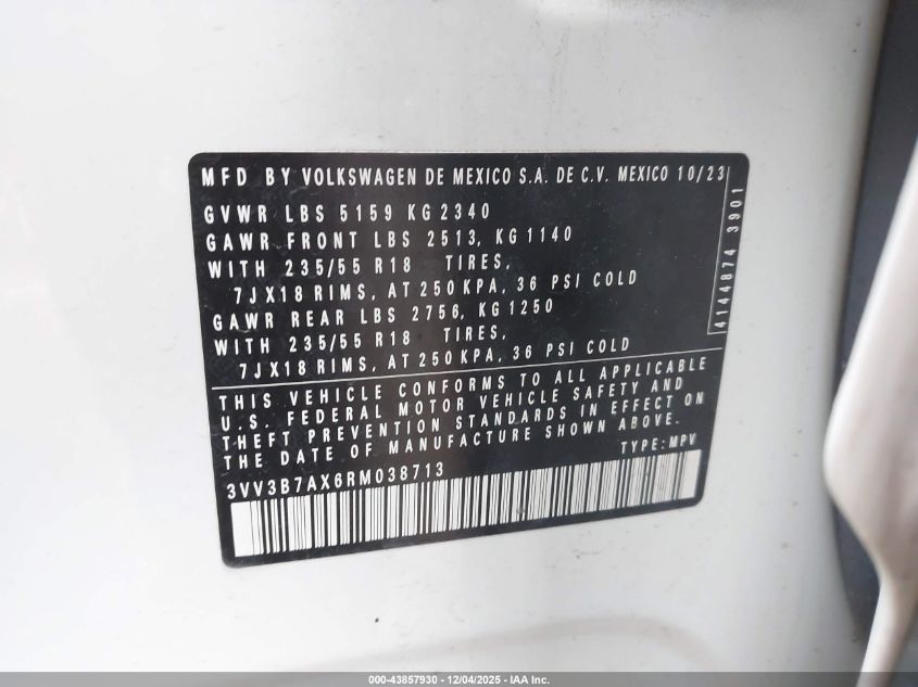2024 VOLKSWAGEN TIGUAN 2024 року Бензин, 2.0, Передній привід, vin - 3VV3B7AX6RM038713 з США