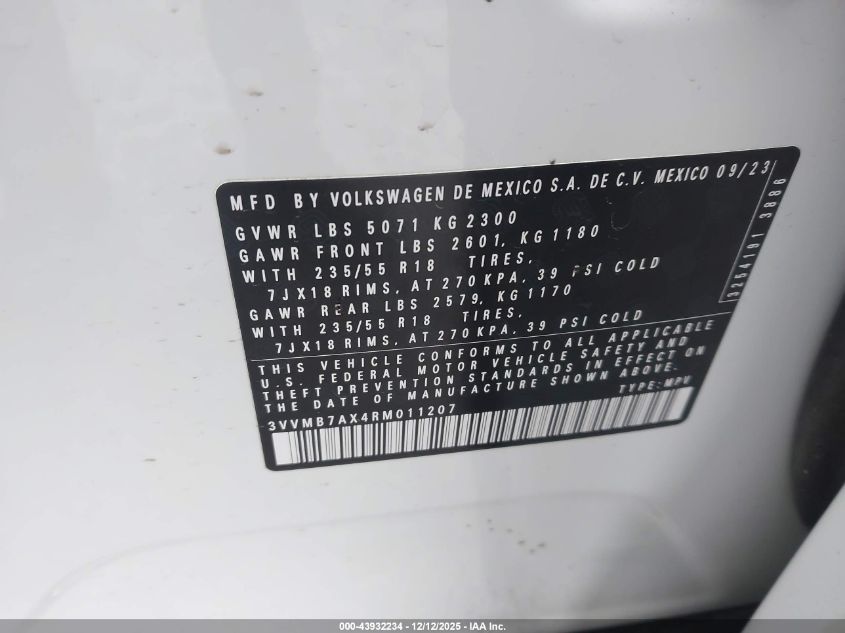 2024 VOLKSWAGEN TIGUAN 2024 року Бензин, 2.0, Повний привід, vin - 3VVMB7AX4RM011207 з США