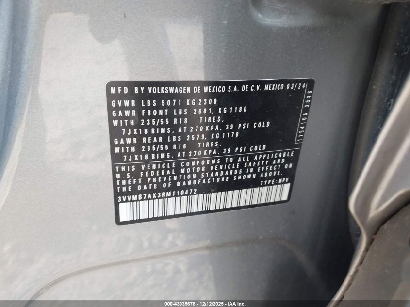 2024 VOLKSWAGEN TIGUAN 2024 року Бензин, 2.0, Повний привід, vin - 3VVMB7AX3RM110472 з США