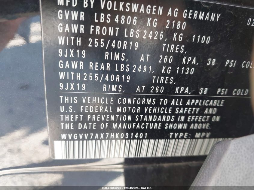 2017 VOLKSWAGEN TIGUAN 2017 року Бензин, 2.0, Передній привід, vin - WVGVV7AX7HK031401 з США