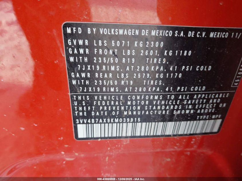 2019 VOLKSWAGEN TIGUAN 2019 року Бензин, 2.0, Повний привід, vin - 3VV4B7AX9KM039915 з США
