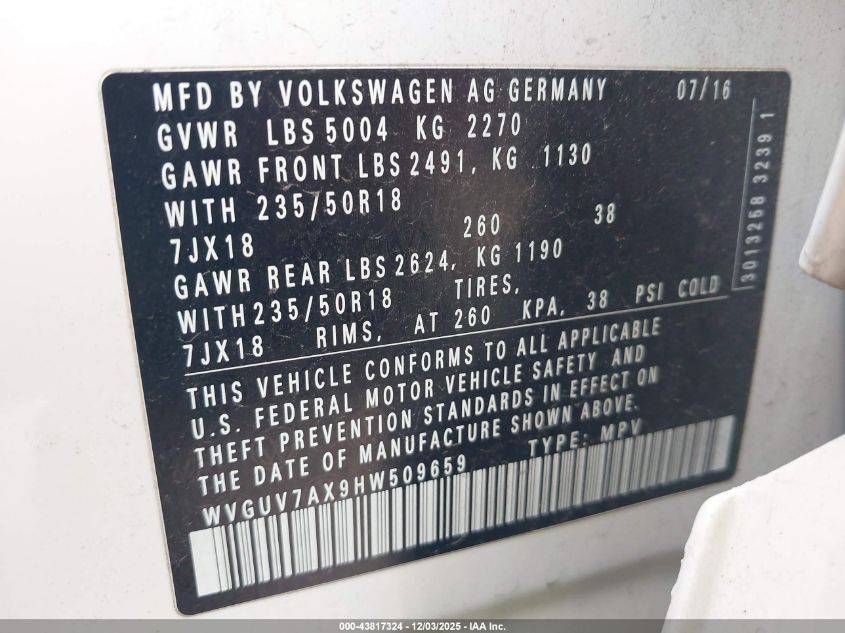 2017 VOLKSWAGEN TIGUAN 2017 року Бензин, 2.0, Повний привід, vin - WVGUV7AX9HW509659 з США