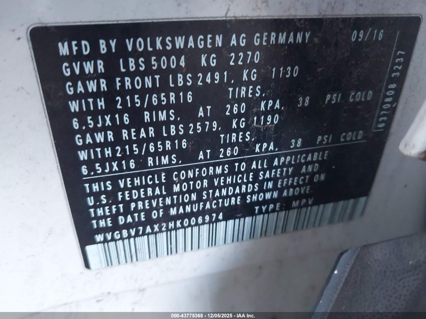 Колір БілийЦиліндри 4Привід Повний привідVIN WVGBV7AX2HK006974Стан СтаціонарноУшкодження Передня або задняДата аукціону 2025-12-16 AutoRIA