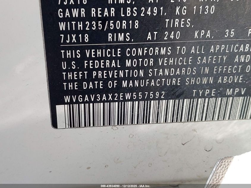 2014 VOLKSWAGEN TIGUAN 2014 року Бензин, 2.0, Передній привід, vin - WVGAV3AX2EW557592 з США