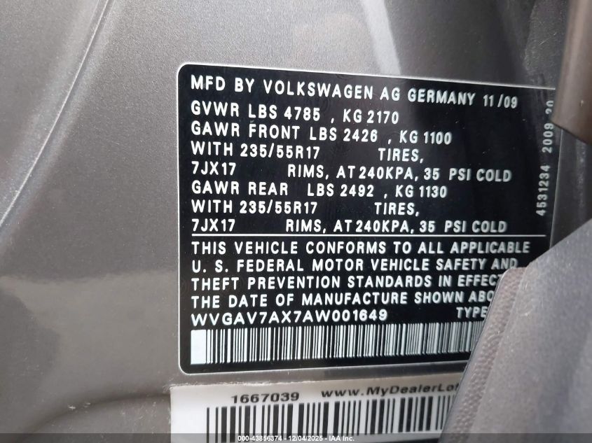 2010 VOLKSWAGEN TIGUAN 2010 року Бензин, 2.0, Передній привід, vin - WVGAV7AX7AW001649 з США