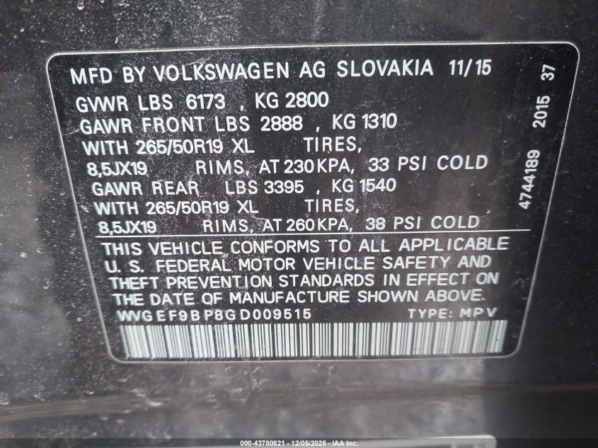 2016 VOLKSWAGEN TOUAREG 2016 року Бензин, 3.6, Повний привід, vin - WVGEF9BP8GD009515 з США