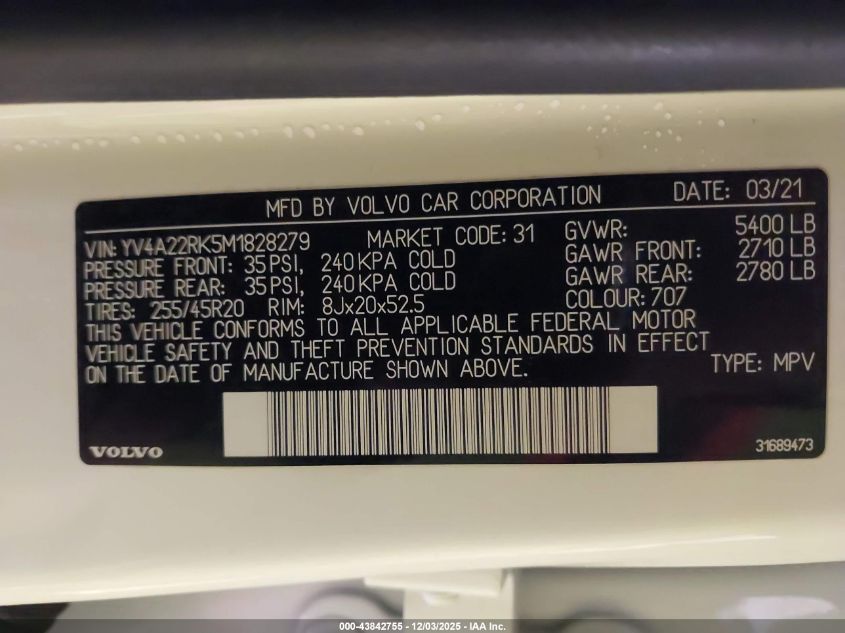 2021 VOLVO XC60 2021 року Бензин, 2.0, Повний привід, vin - YV4A22RK5M1828279 з США